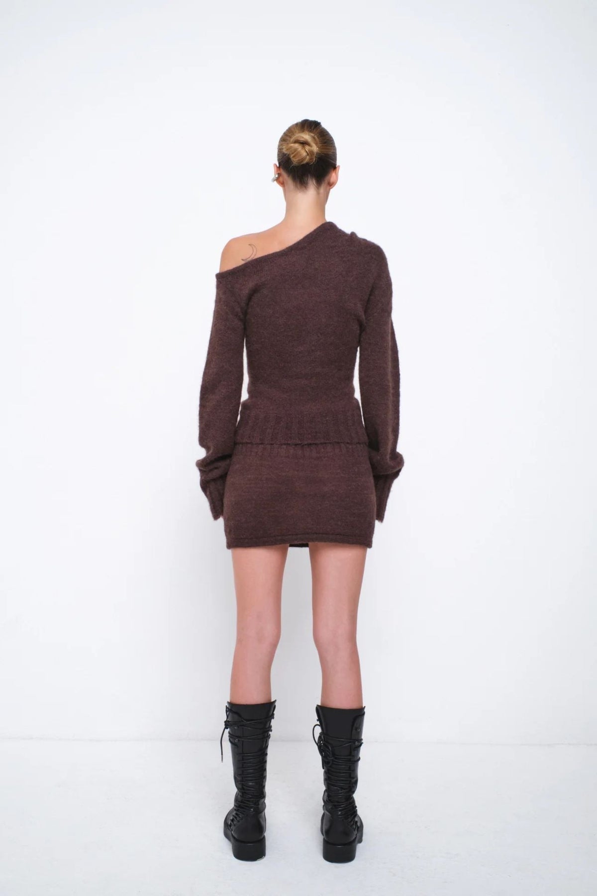 This brown one-shoulder knit top delivers a refined balance between minimalism and contemporary sophistication. Crafted from a soft, tactile yarn, it gently hugs the body, creating a streamlined silhouette that feels both effortless and luxurious. The asymmetrical neckline introduces a sculptural element, drawing attention to the shoulders while adding a subtle, elevated twist to classic knitwear. A softly draped knot detail enhances the design with a sense of movement and craftsmanship, giving the top a distinctive identity without overwhelming its clean aesthetic. The ribbed hem adds structure, ensuring a comfortable and flattering fit. Its versatile grey shade allows for endless styling possibilities, making it suitable for relaxed daytime outfits as well as refined evening combinations. Pair it with matching knit pants for a coordinated look or mix it with tailored pieces for a more polished effect. This top is an ideal choice for those seeking an elegant, modern garment that merges understated design with luxurious comfort.