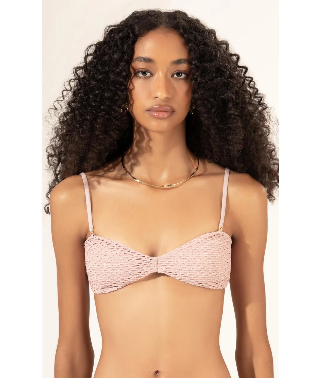 The bikini has that easy, cool girl sparkle without trying too hard. The bustier top comes in a clean bandeau shape with lightly structured cups that sit flat on the body, giving soft support and a natural line under open shirts or kaftans. Slim adjustable straps frame the shoulders and let you tweak the fit so it feels secure but never tight. The mesh fabric is soft to the touch, with metallic threads that catch the light in a subtle, glowing way rather than full shine. The matching canal style bottom features double rolote straps on each hip and a slightly higher cut leg, which lengthens the silhouette and highlights your tan. Its back offers cheeky coverage that still feels wearable for a resort day plans. In a delicate rose tone, this set works beautifully from poolside to seaside drinks with just cool shorts and sandals.