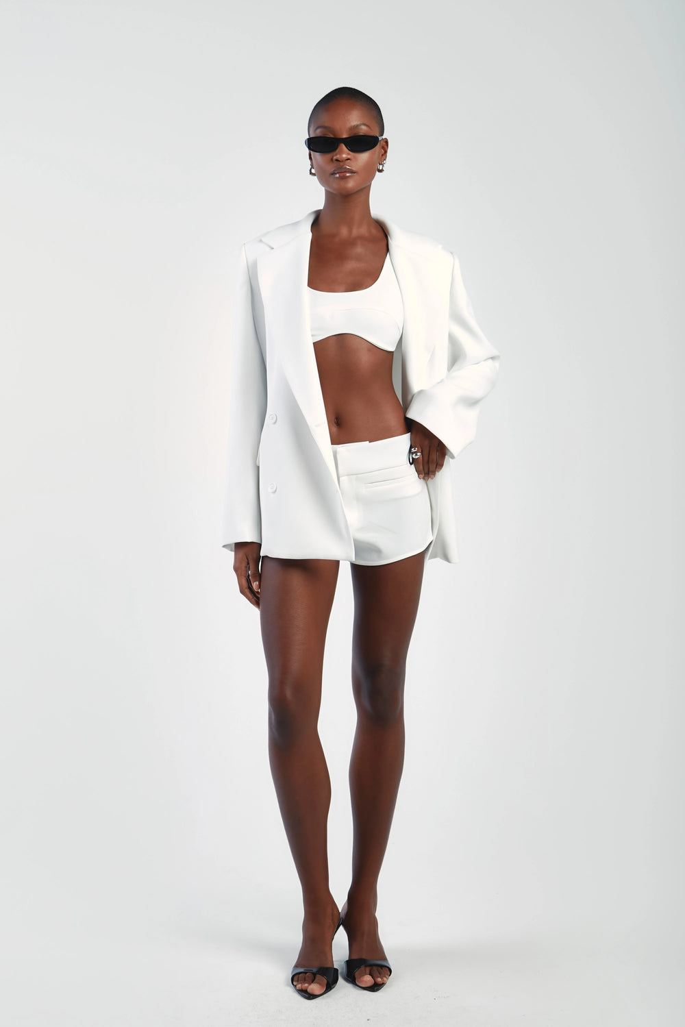 Questo elegante top è sapientemente realizzato in crêpe di acetato foderato, che offre una texture raffinata e un grazioso drappeggio. Progettato con un modello halter con delicate spalline sottili, presenta lacci regolabili che consentono una vestibilità personalizzata e un comfort ottimale. Il dettaglio della cucitura orizzontale aggiunge una struttura discreta e un tocco visivo interessante, esaltando la silhouette minimalista. Perfetto sia per le occasioni formali che per i look casual più sofisticati, questo capo combina un design senza tempo con una moderna adattabilità per completare il tuo guardaroba con un lusso discreto.