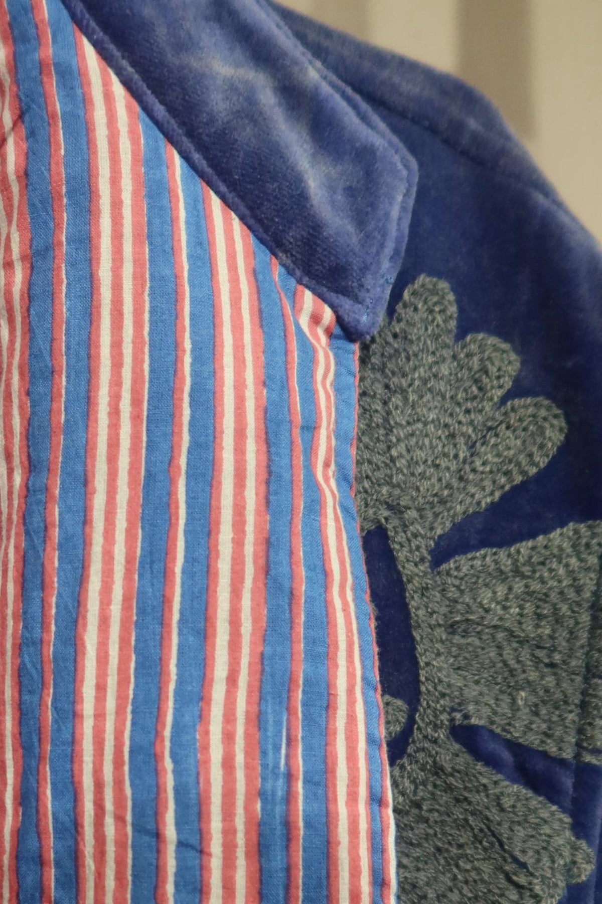 Giacca lunga realizzata in velluto di cotone blu indaco intenso, impreziosita da ricami floreali nei toni del salvia e del grigio tenue. Realizzata con cura artigianale, presenta ricami in rilievo che esaltano la morbidezza e la profondità del tessuto, creando un raffinato gioco di luci e texture. Il taglio lungo e dritto, il collo arrotondato e le maniche leggermente ampie offrono una vestibilità armoniosa, bilanciando comfort e struttura. L'interno è foderato in cotone a righe verticali corallo, blu e avorio, un dettaglio distintivo che aggiunge freschezza e carattere. Ogni cucitura è accuratamente rifinita per garantire resistenza e qualità nel tempo. Pensata per accompagnare la mezza stagione con stile, si distingue per il suo equilibrio tra tradizione sartoriale e ricerca estetica. Un capo che incarna l'unione di materiali pregiati, meticolosa lavorazione artigianale e gusto contemporaneo, ideale per chi apprezza l'eleganza senza tempo espressa con autenticità e raffinatezza.