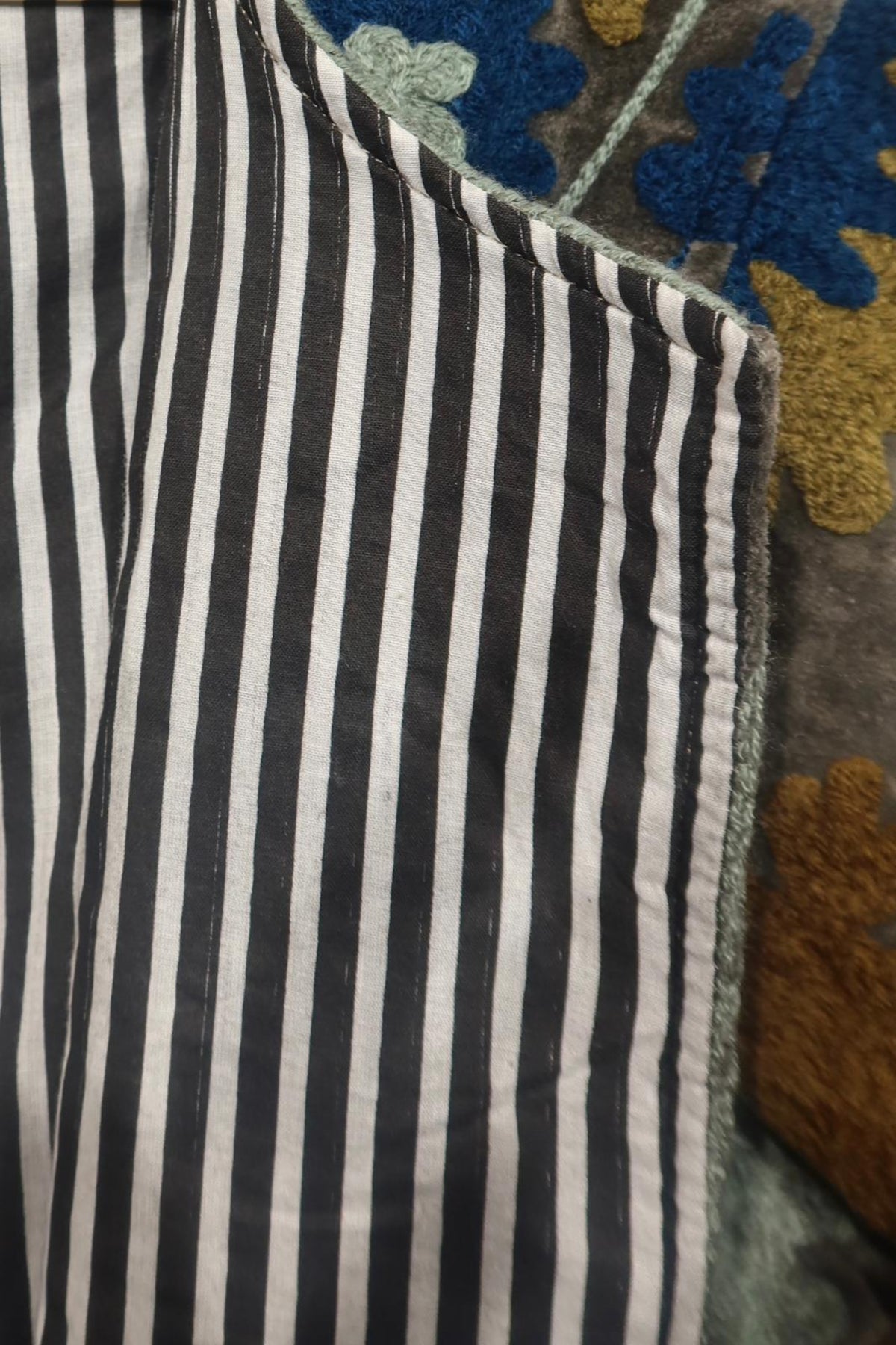 Giacca realizzata in velluto di cotone grigio fumo, impreziosita da ricami floreali nei toni dell'azzurro intenso, dell'ocra dorato e del salvia pallido. Realizzata con cura artigianale, presenta ricami in rilievo che esaltano la morbidezza e la profondità del tessuto, creando un raffinato gioco di luci e texture. Il taglio dritto, il collo arrotondato e le maniche leggermente ampie offrono una vestibilità armoniosa, bilanciando comfort e struttura. L'interno è foderato in cotone a righe verticali bianche e nere, un dettaglio distintivo che aggiunge freschezza e carattere. Ogni cucitura è accuratamente rifinita per garantire resistenza e qualità nel tempo. Pensata per accompagnare la mezza stagione con stile, si distingue per il suo equilibrio tra tradizione sartoriale e ricerca estetica. Un capo che incarna l'unione di materiali pregiati, meticolosa lavorazione artigianale e gusto contemporaneo, ideale per chi apprezza l'eleganza senza tempo espressa con autenticità e raffinatezza.