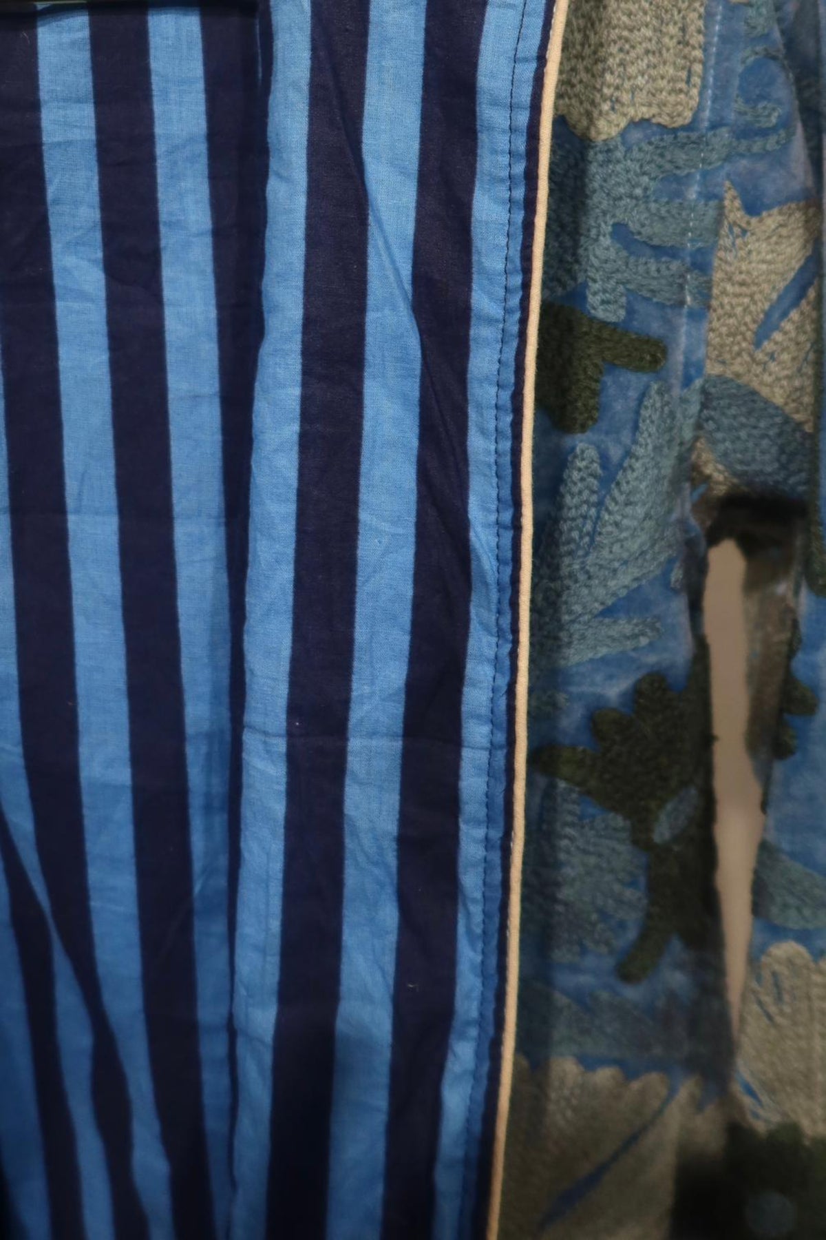 Giacca realizzata in morbido velluto di cotone azzurro cielo, impreziosita da ricami floreali nei toni del salvia, dell'oliva e dell'avorio. Realizzata con cura artigianale, presenta ricami a rilievo che esaltano la morbidezza e la profondità del tessuto, creando un raffinato gioco di luci e texture. Il taglio dritto, il collo arrotondato e le maniche leggermente ampie offrono una vestibilità armoniosa, bilanciando comfort e struttura. L'interno è foderato in cotone a righe verticali blu navy e azzurro, un dettaglio distintivo che aggiunge freschezza e carattere. Ogni cucitura è accuratamente rifinita per garantire resistenza e qualità nel tempo. Pensata per accompagnare la mezza stagione con stile, si distingue per il suo equilibrio tra tradizione sartoriale e ricerca estetica. Un capo che incarna l'unione di materiali pregiati, meticolosa lavorazione artigianale e gusto contemporaneo, ideale per chi apprezza l'eleganza senza tempo espressa con autenticità e raffinatezza.