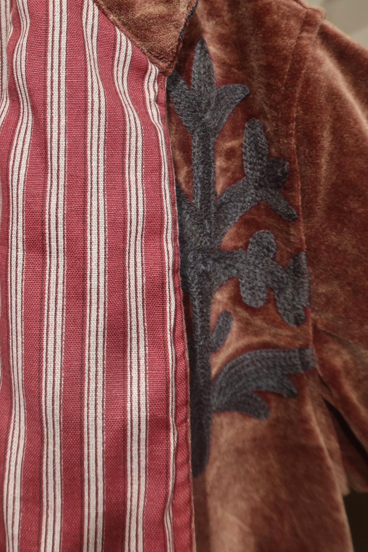 Giacca lunga realizzata in morbido velluto di cotone color cacao, impreziosita da ricami floreali nei toni del verde bosco intenso e del muschio tenue. Realizzata con cura artigianale, presenta ricami a rilievo che esaltano la morbidezza e la profondità del tessuto, creando un raffinato gioco di luci e texture. Il taglio lungo e dritto, il collo arrotondato e le maniche leggermente ampie offrono una vestibilità armoniosa, bilanciando comfort e struttura. L'interno è foderato in cotone a righe verticali rosso mattone e avorio, un dettaglio distintivo che aggiunge calore e carattere. Ogni cucitura è accuratamente rifinita per garantire resistenza e qualità nel tempo. Pensata per accompagnare la mezza stagione con stile, si distingue per il suo equilibrio tra tradizione sartoriale e ricerca estetica. Un capo lungo ed elegante che incarna l'unione di materiali pregiati, meticolosa lavorazione artigianale e gusto contemporaneo, ideale per chi apprezza l'eleganza senza tempo espressa con autenticità e raffinatezza.