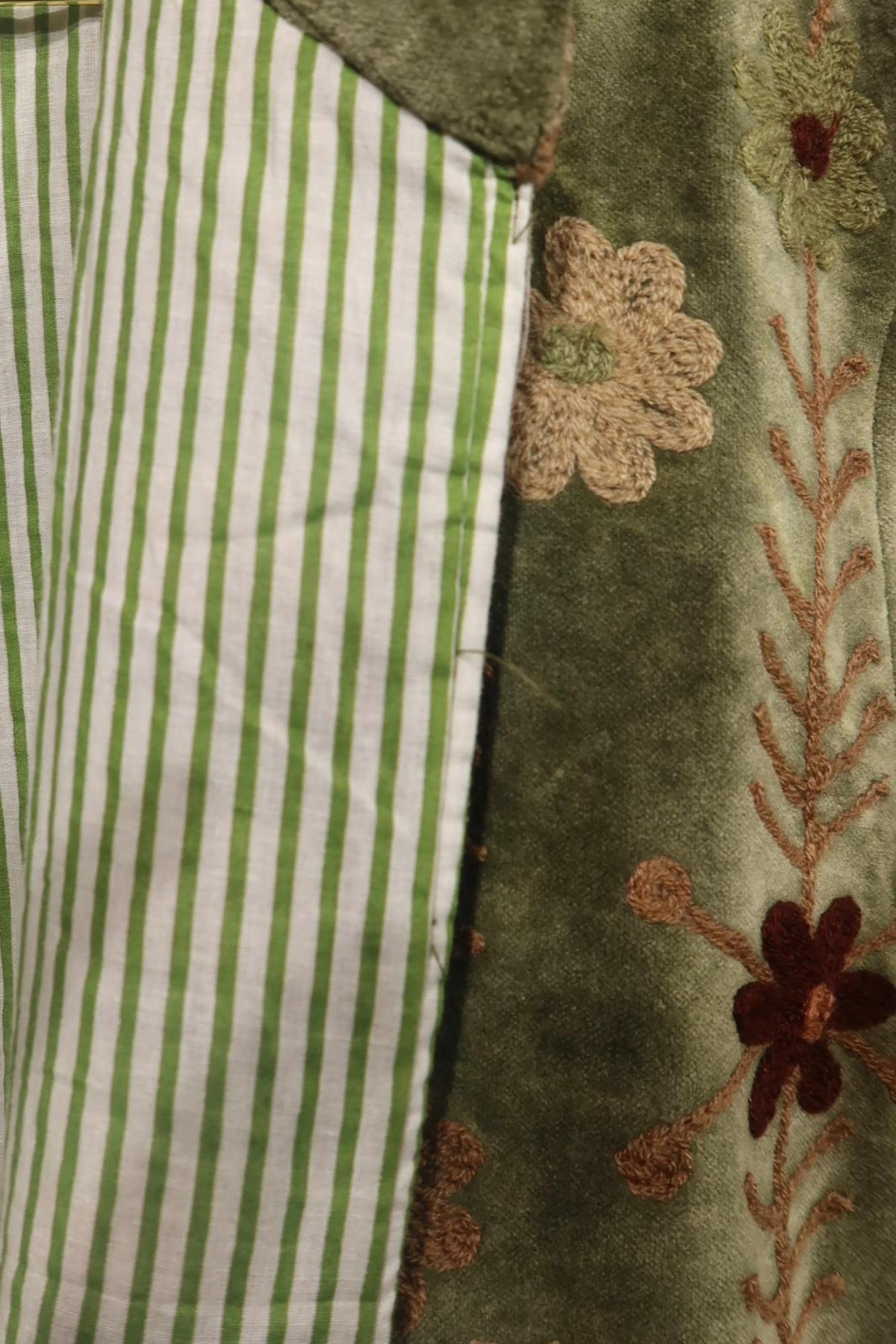 Soprabito realizzato in morbido velluto di cotone verde salvia, impreziosito da ricami floreali nei toni caldi del beige, del castagno e dell'oliva. Realizzato con cura artigianale, presenta ricami a rilievo che esaltano la morbidezza e la profondità del tessuto, creando un raffinato gioco di luci e texture. Il taglio dritto, il collo arrotondato e le maniche leggermente ampie offrono una vestibilità armoniosa, bilanciando comfort e struttura. L'interno è foderato in cotone a righe verticali bianche e verde chiaro, un dettaglio distintivo che aggiunge freschezza e carattere. Ogni cucitura è accuratamente rifinita per garantire resistenza e qualità nel tempo. Pensato per accompagnare la mezza stagione con stile, si distingue per il suo equilibrio tra tradizione sartoriale e ricerca estetica. Un capo che incarna l'unione di materiali pregiati, meticolosa lavorazione artigianale e gusto contemporaneo, ideale per chi apprezza un'eleganza senza tempo espressa con autenticità e raffinatezza.