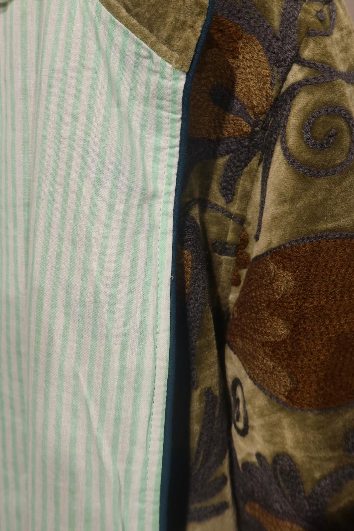 Giacca realizzata in velluto di cotone verde oliva, impreziosita da ricami floreali nei toni del blu ardesia e del marrone dorato. Realizzata con cura artigianale, presenta ricami in rilievo che esaltano la morbidezza e la profondità del tessuto, creando un raffinato gioco di luci e texture. Il taglio dritto, il collo arrotondato e le maniche leggermente ampie offrono una vestibilità armoniosa, bilanciando comfort e struttura. L'interno è foderato in cotone a righe verticali bianche e verde chiaro, un dettaglio distintivo che aggiunge freschezza e carattere. Ogni cucitura è accuratamente rifinita per garantire resistenza e qualità nel tempo. Pensata per accompagnare la mezza stagione con stile, si distingue per il suo equilibrio tra tradizione sartoriale e ricerca estetica. Un capo che incarna l'unione di materiali pregiati, meticolosa lavorazione artigianale e gusto contemporaneo, ideale per chi apprezza l'eleganza senza tempo espressa con autenticità e raffinatezza.