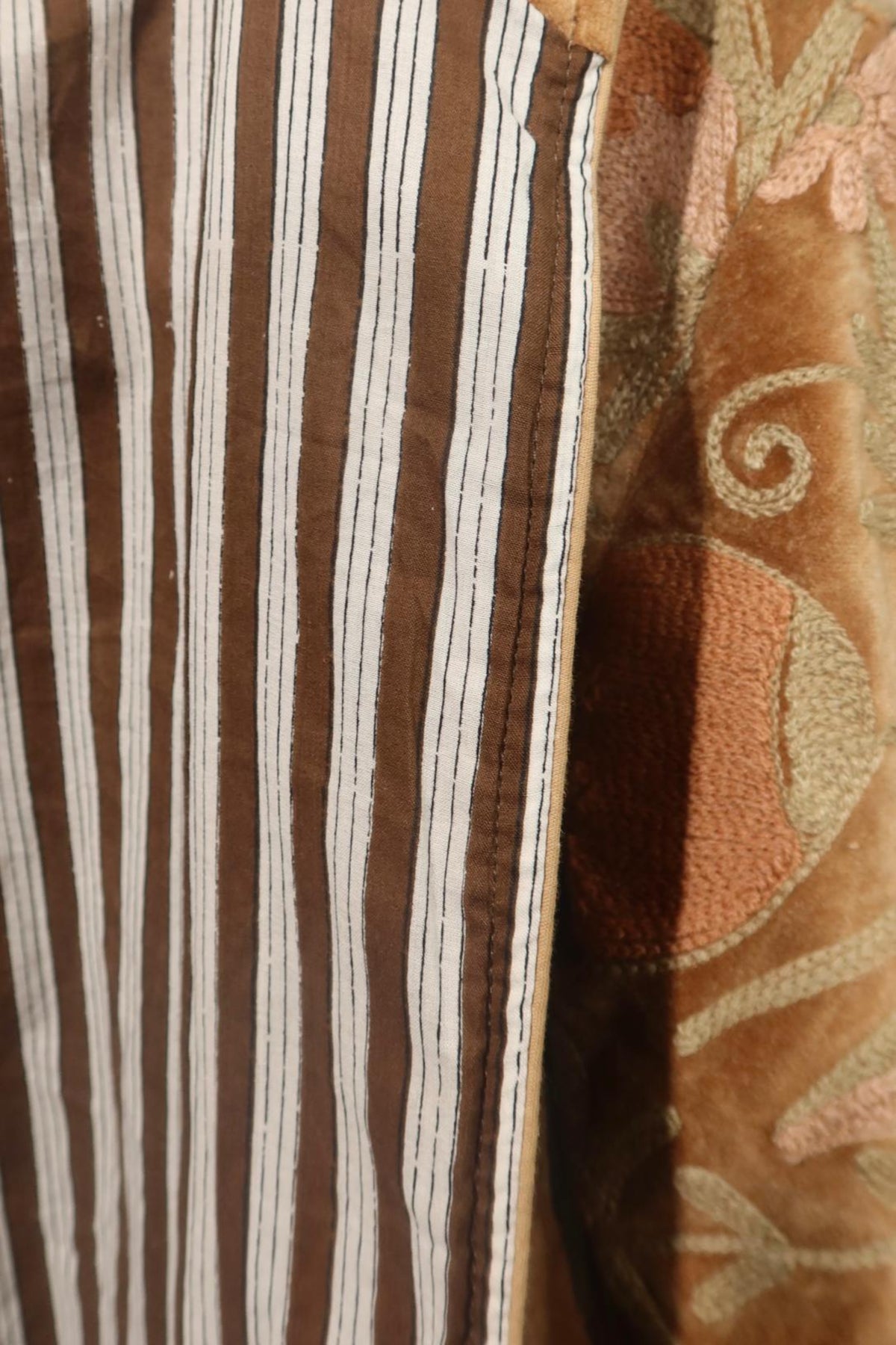 Giacca realizzata in morbido velluto di cotone color caramello, impreziosita da ricami floreali nei toni del rosa pallido, del verde salvia e del corallo tenue. Realizzata con cura artigianale, presenta ricami in rilievo che esaltano la morbidezza e la profondità del tessuto, creando un raffinato gioco di luci e texture. Il taglio dritto, il collo arrotondato e le maniche leggermente ampie offrono una vestibilità armoniosa, bilanciando comfort e struttura. L'interno è foderato in cotone a righe verticali nei toni del marrone e del bianco, un dettaglio distintivo che aggiunge contrasto e carattere. Ogni cucitura è accuratamente rifinita per garantire resistenza e qualità nel tempo. Pensata per accompagnare la mezza stagione con stile, si distingue per il suo equilibrio tra tradizione sartoriale e ricerca estetica. Un capo che incarna l'unione di materiali pregiati, meticolosa lavorazione artigianale e gusto contemporaneo, ideale per chi apprezza l'eleganza senza tempo espressa con autenticità e raffinatezza.