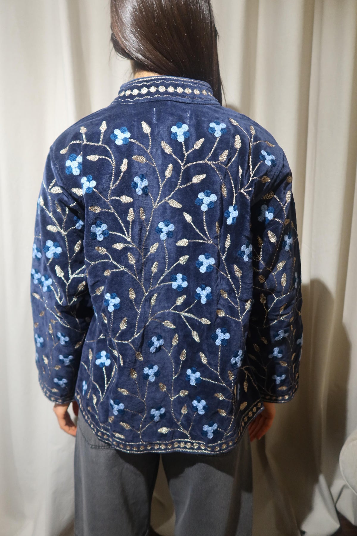 Jacket crafted from soft warm midnight-blue cotton velvet, embellished with floral embroidery in light blue, teal, and deep blue tones, enriched by subtle golden details. Made with artisanal care, it features raised embroidery that enhances the softness and depth of the fabric, creating a refined play of light and texture. The straight cut, rounded collar, and slightly wide sleeves offer a harmonious fit, balancing comfort and structure. The interior is lined with cotton featuring vertical stripes in cream and deep blue, a distinctive detail that adds character and sophistication. Each seam is carefully finished to ensure durability and lasting quality. Designed to accompany the mid-season with style, it stands out for its balance between sartorial tradition and aesthetic research. A garment that embodies the union of premium materials, meticulous craftsmanship, and contemporary taste ideal for those who appreciate timeless elegance expressed with authenticity and refinement. Crafted to merge expressive hues and elegant detailing, it represents a versatile piece meant to elevate everyday dressing with understated distinction.