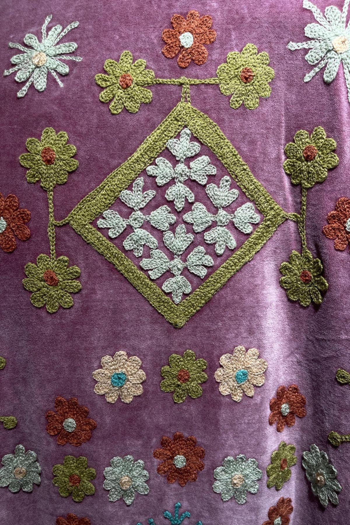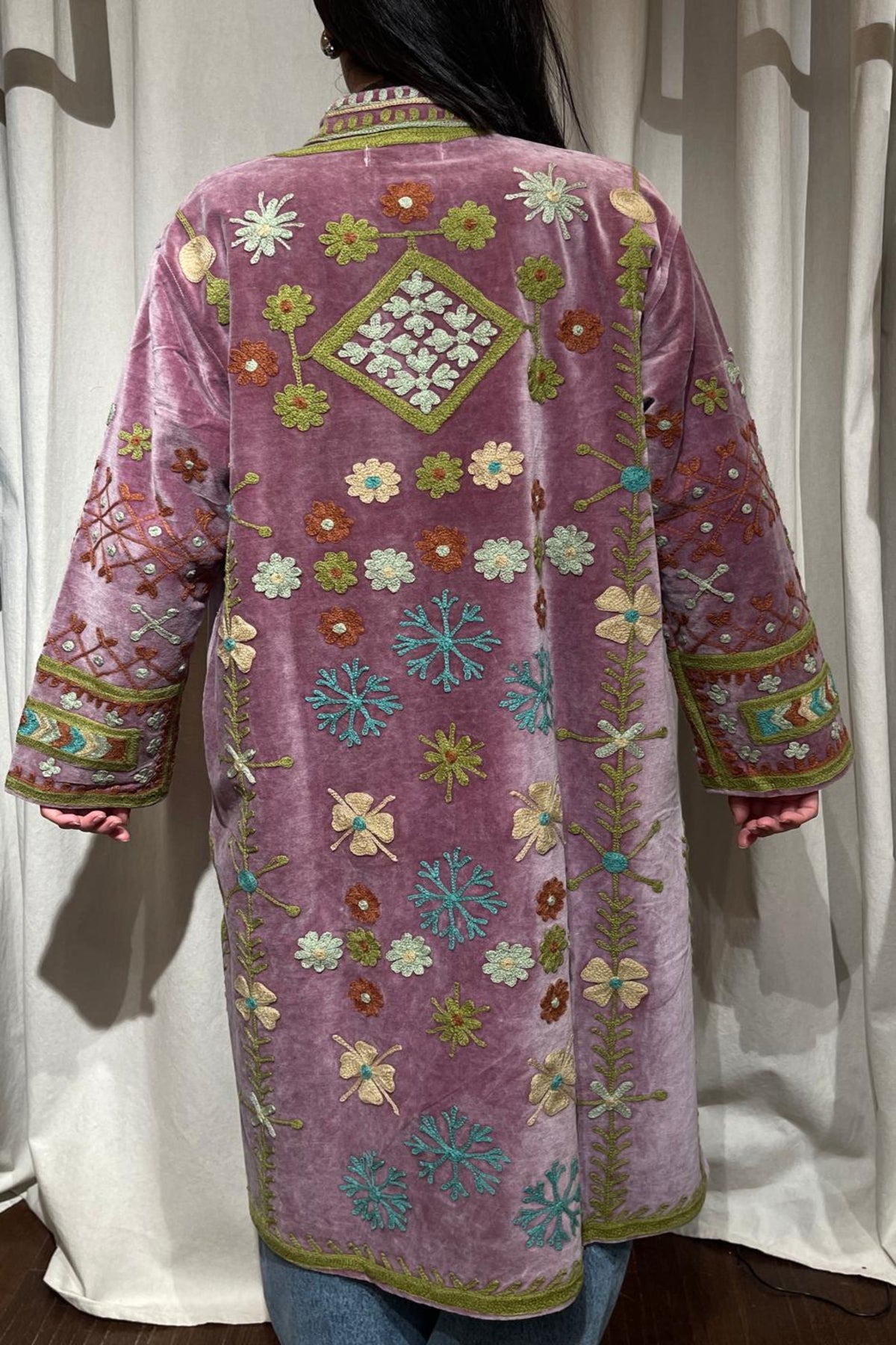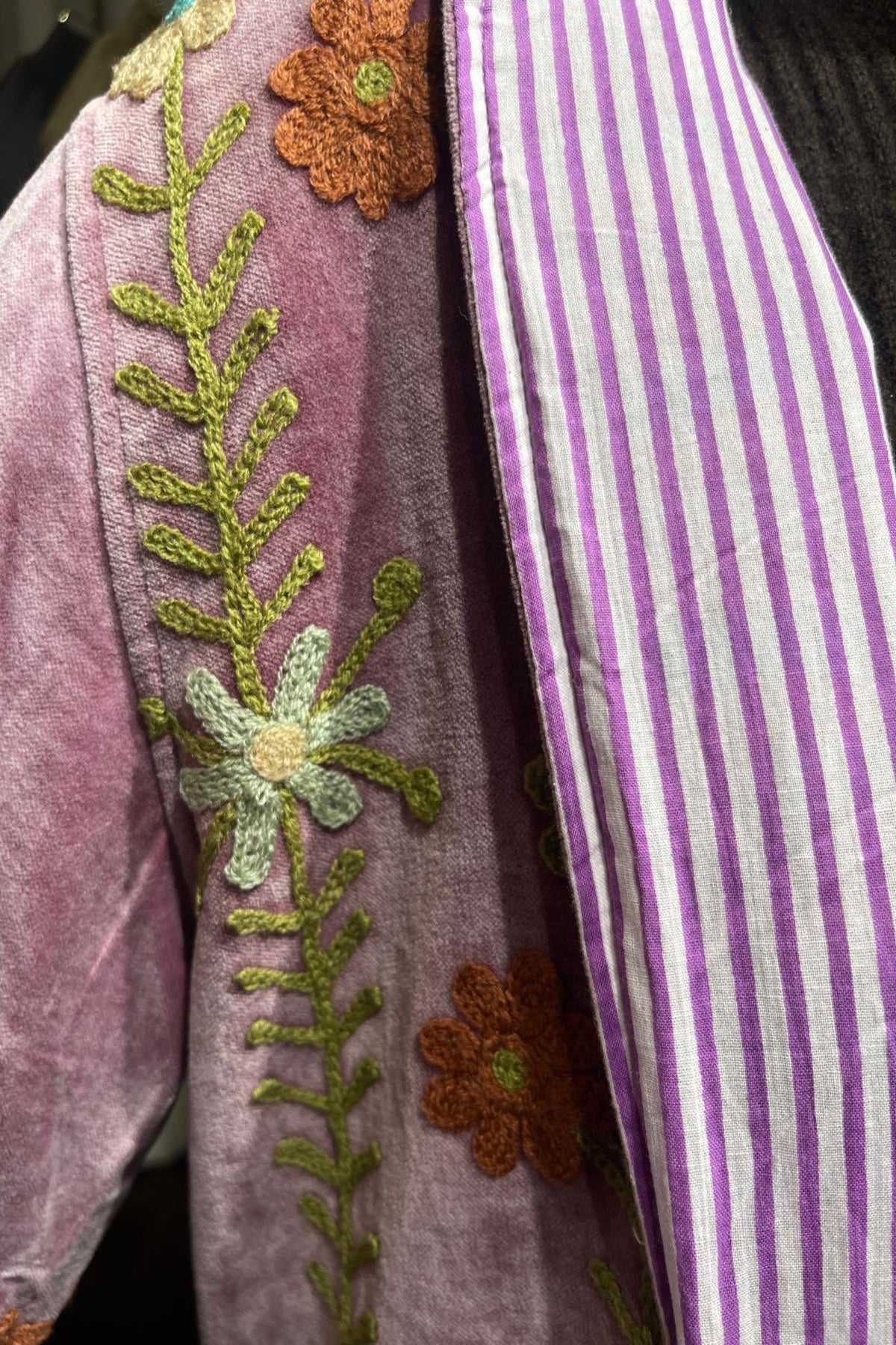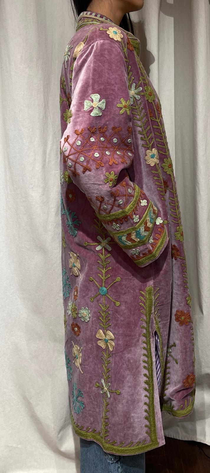 Overcoat crafted from soft lilac cotton velvet, embellished with floral embroidery in olive green, terracotta, pale mint, and turquoise tones. Made with artisanal care, it features raised embroidery that enhances the softness and depth of the fabric, creating a refined play of light and texture. The long, straight cut, stand collar, and wide sleeves offer a harmonious fit, balancing comfort and structure. Olive edging frames the front opening and hem, while striped collar panels add a distinctive handcrafted accent. The sleeves are finished with embroidered lattice motifs and cuff bands, punctuated by small reflective details that add brightness and movement. The interior is lined with cotton featuring vertical stripes in violet and white, a distinctive detail that adds character and sophistication. Each seam is carefully finished to ensure durability and lasting quality. Designed to accompany the mid-season with style, it stands out for its balance between sartorial tradition and aesthetic research. A garment that embodies premium materials, meticulous craftsmanship, and contemporary taste.