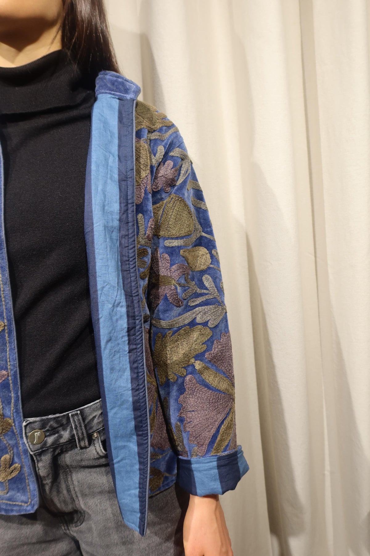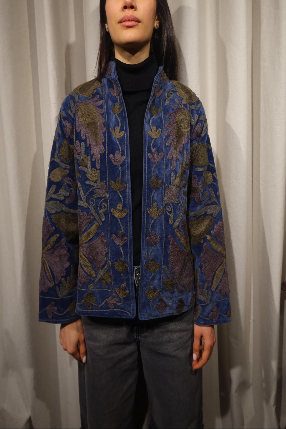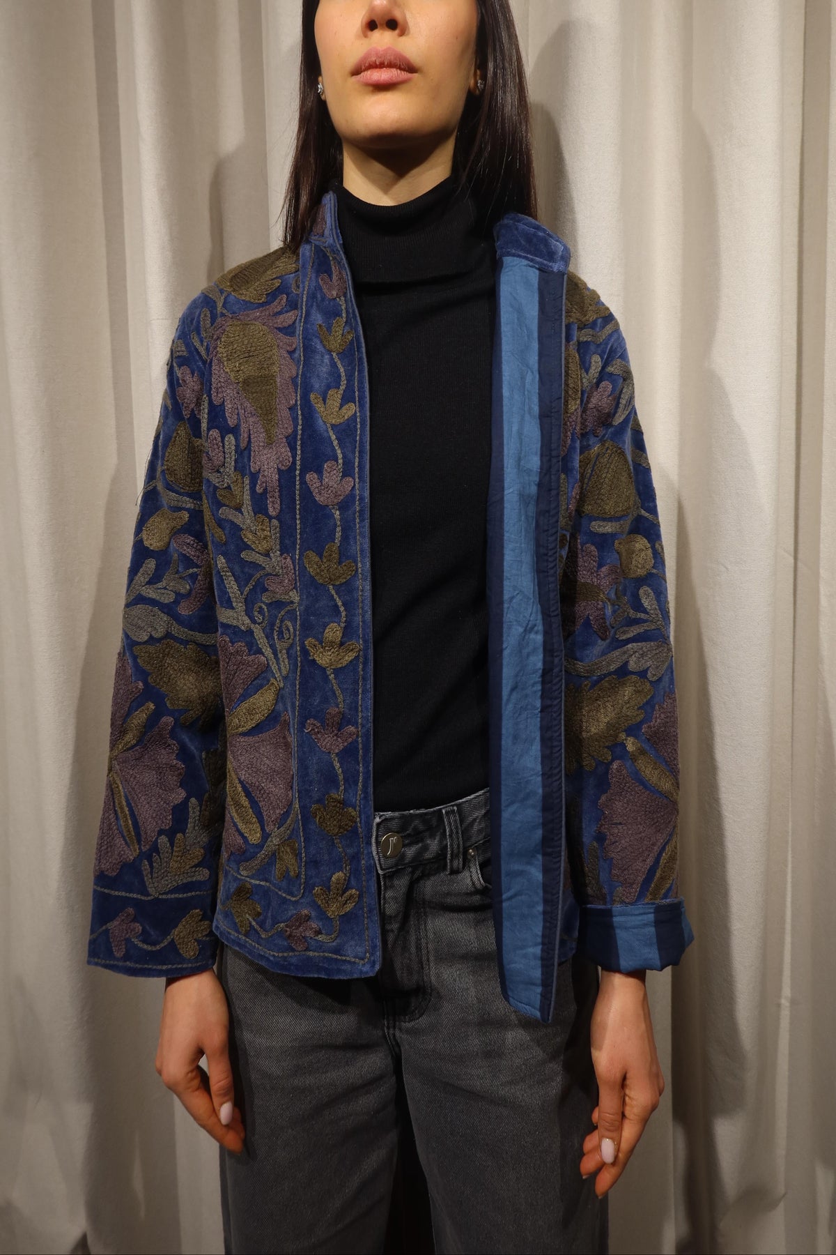 Jacket crafted from soft warm denim-blue cotton velvet, embellished with floral embroidery in olive green, muted mustard, and taupe tones. Made with artisanal care, it features raised embroidery that enhances the softness and depth of the fabric, creating a refined play of light and texture. The straight cut, rounded collar, and slightly wide sleeves offer a harmonious fit, balancing comfort and structure. The interior is lined with cotton featuring vertical stripes in navy and teal, a distinctive detail that adds character and sophistication. Each seam is carefully finished to ensure durability and lasting quality. Designed to accompany the mid-season with style, it stands out for its balance between sartorial tradition and aesthetic research. A garment that embodies the union of premium materials, meticulous craftsmanship, and contemporary taste ideal for those who appreciate timeless elegance expressed with authenticity and refinement. Crafted to merge expressive tones and subtle detailing, it represents a versatile piece meant to elevate everyday dressing with understated distinction.