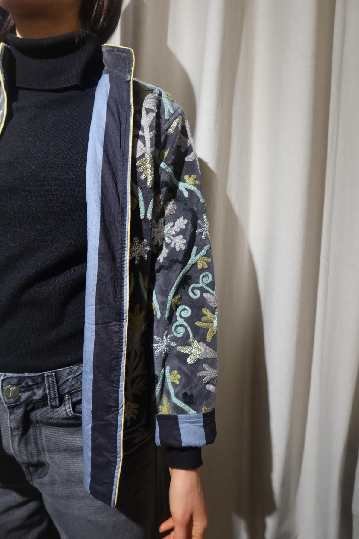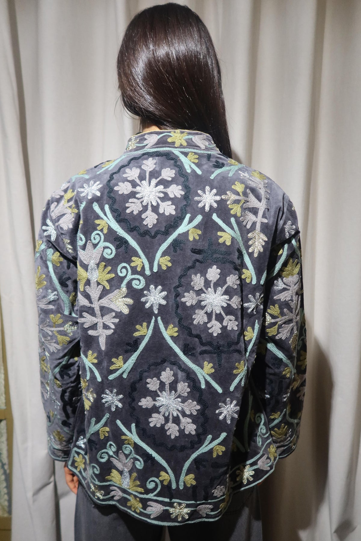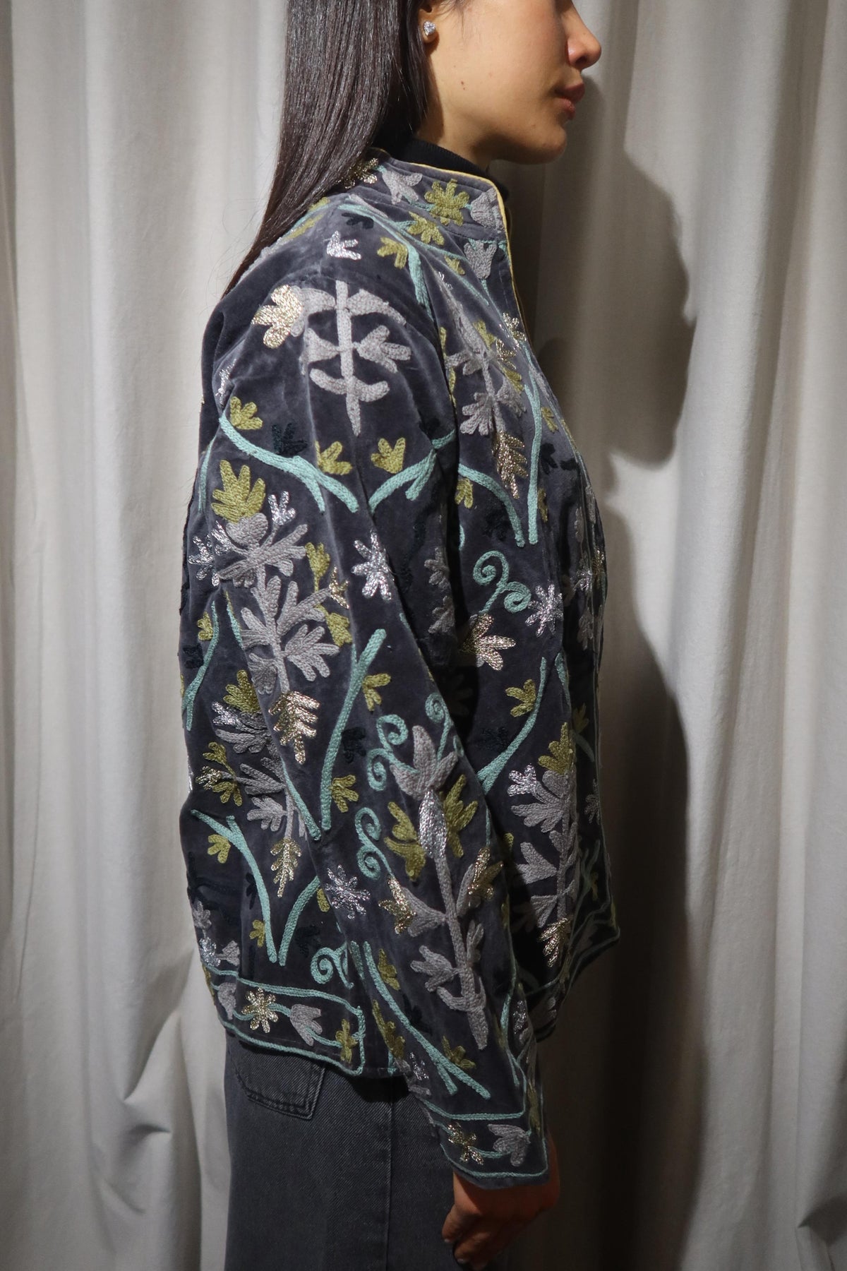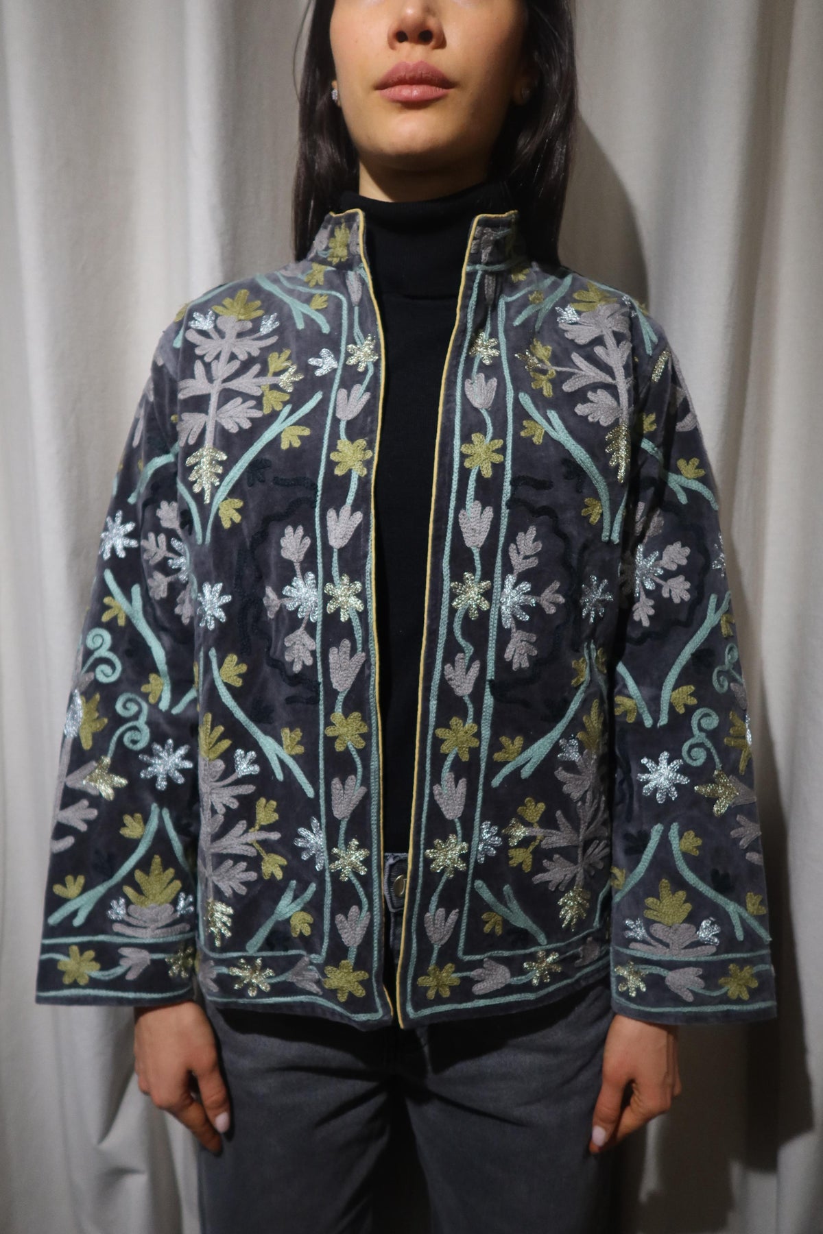 Jacket crafted from soft dark-taupe cotton velvet, embellished with floral embroidery in warm beige, bright yellow, pale sage, and metallic gold and silver accents. Made with artisanal care, it features raised embroidery that enhances the softness and depth of the fabric, creating a refined play of light and texture. The straight cut, rounded collar, and slightly wide sleeves offer a harmonious fit, balancing comfort and structure. The interior is lined with cotton featuring vertical stripes in chocolate brown and soft dove grey a distinctive detail that adds character and sophistication. Each seam is carefully finished to ensure durability and lasting quality. Designed to accompany the mid-season with style, it stands out for its balance between sartorial tradition and aesthetic research. A garment that embodies the union of premium materials, meticulous craftsmanship, and contemporary taste ideal for those who appreciate timeless elegance expressed with authenticity and refinement.
