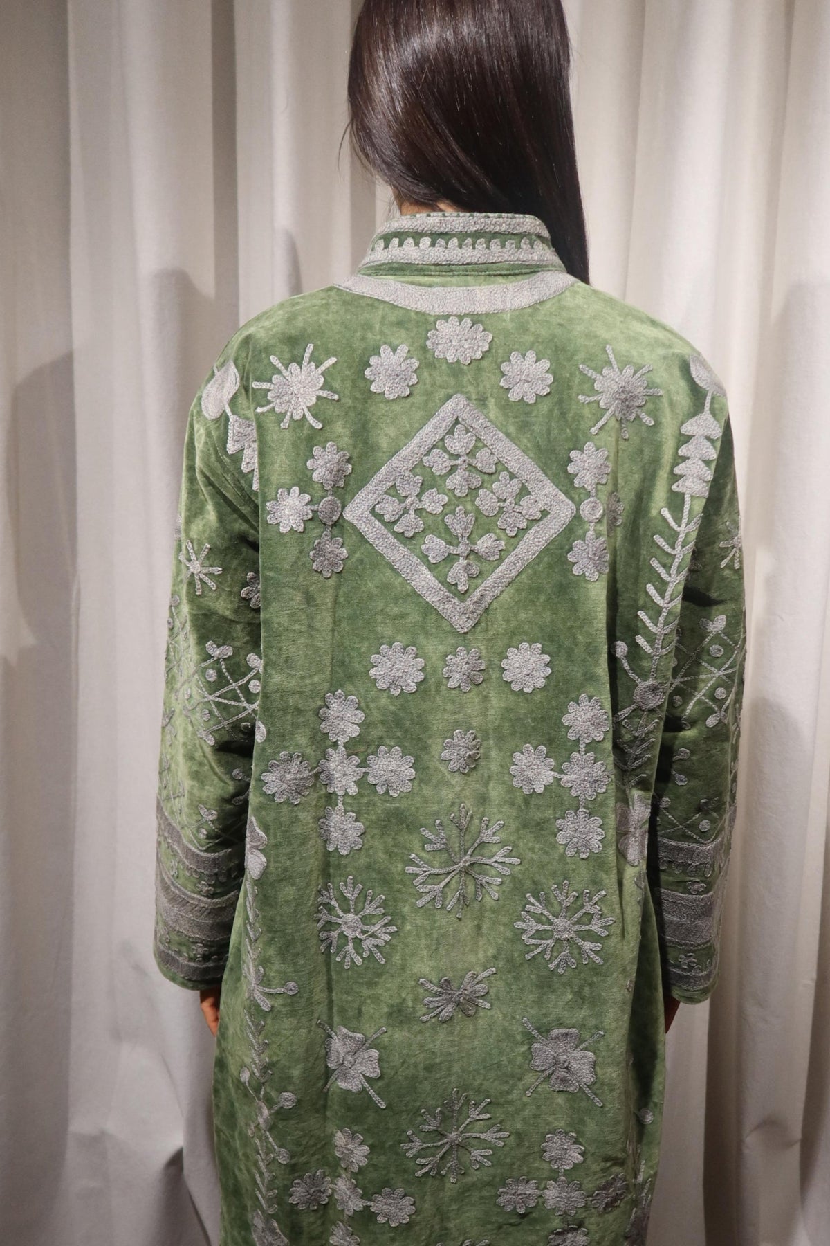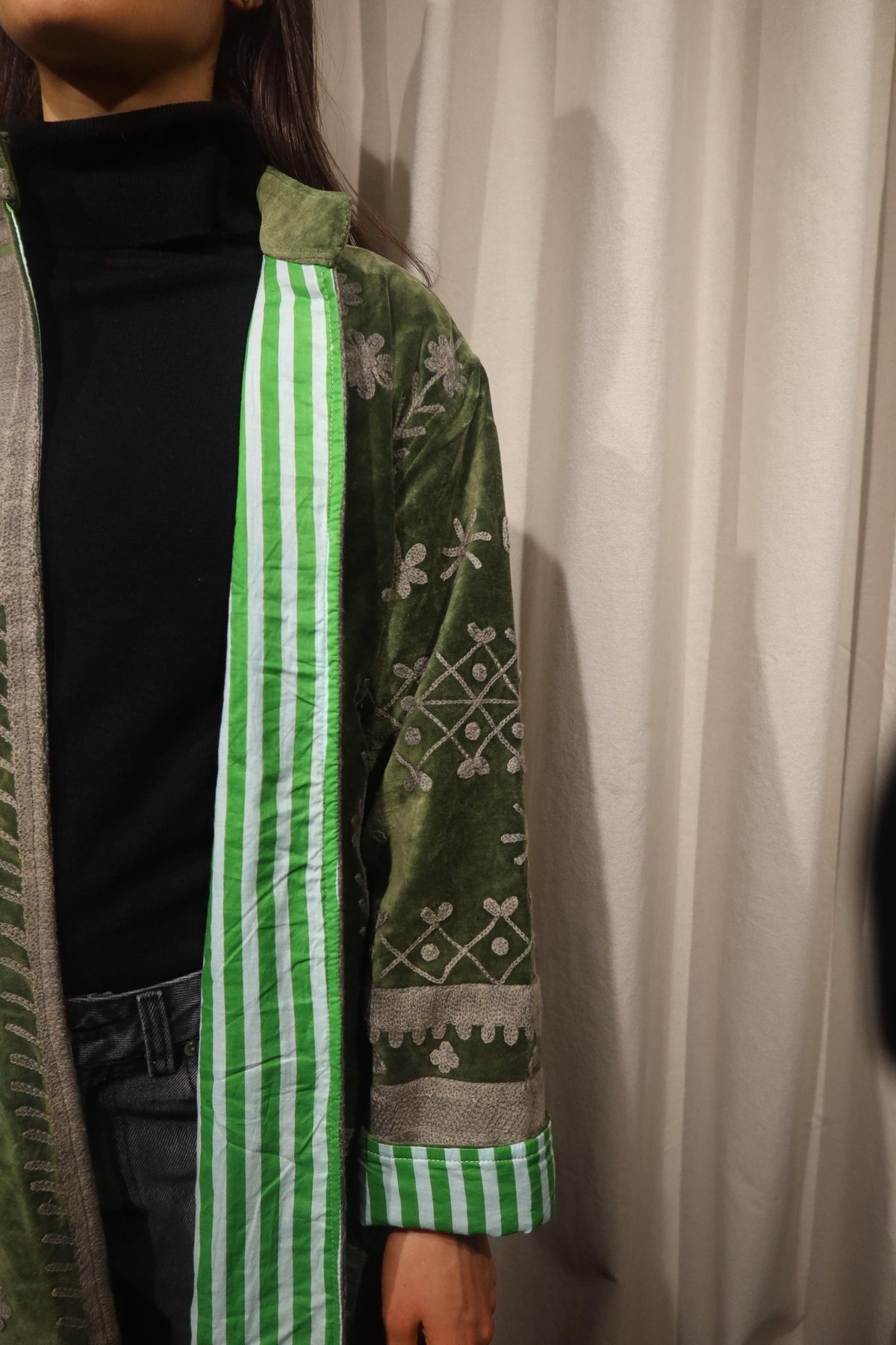 Jacket crafted from soft sage-green cotton velvet, embellished with floral embroidery in warm beige and light taupe tones. Made with artisanal care, it features raised embroidery that enhances the softness and depth of the fabric, creating a refined play of light and texture. The straight cut, rounded collar, and slightly wide sleeves offer a harmonious fit, balancing comfort and structure. The interior is lined with cotton featuring vertical stripes in bright leaf-green and white a distinctive detail that adds freshness and character. Each seam is carefully finished to ensure durability and lasting quality. Designed to accompany the mid-season with style, it stands out for its balance between sartorial tradition and aesthetic research. A garment that embodies the union of premium materials, meticulous craftsmanship, and contemporary taste ideal for those who appreciate timeless elegance expressed with authenticity and refinement. This jacket elevates everyday dressing through its harmonious palette, thoughtful construction, and expressive embroidered motifs, making it a meaningful addition to a curated wardrobe.