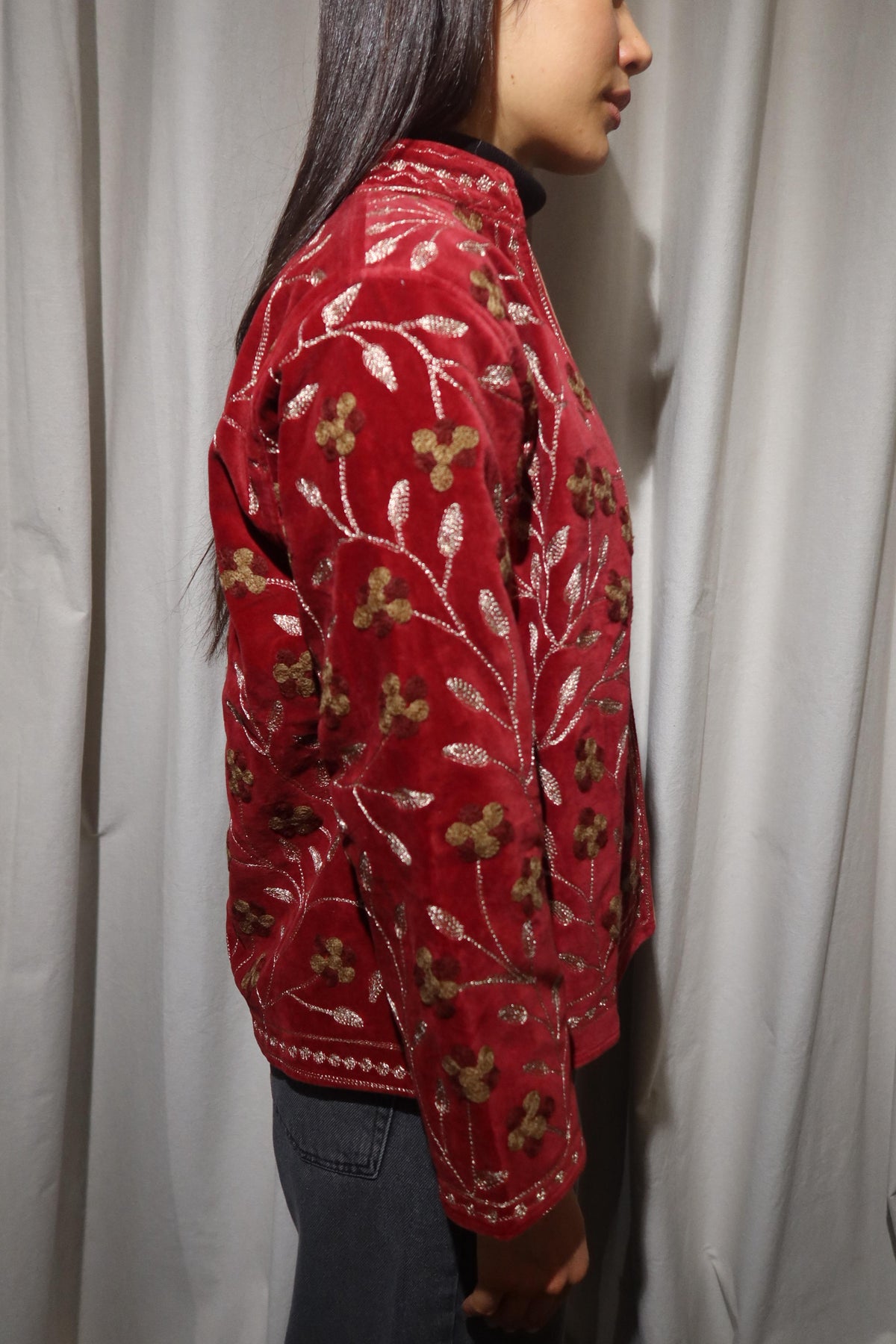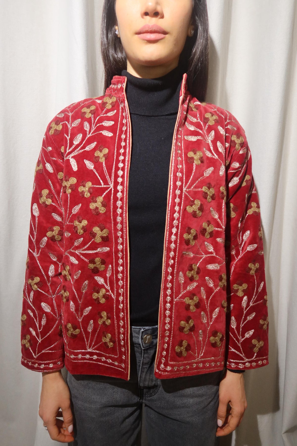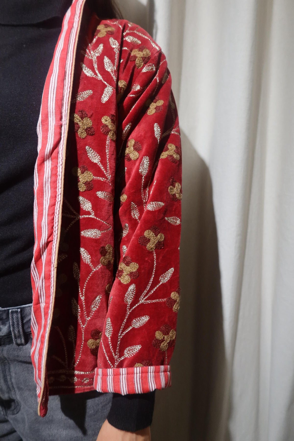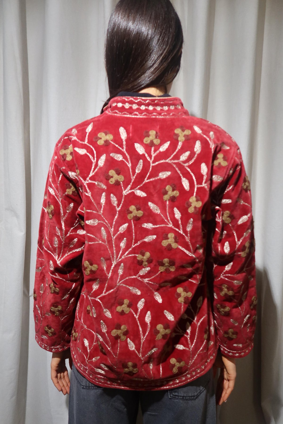 Jacket crafted from soft warm ruby-red cotton velvet, embellished with floral embroidery in gold, bronze, and warm beige tones. Made with artisanal care, it features raised embroidery that enhances the softness and depth of the fabric, creating a refined play of light and texture. The straight cut, rounded collar, and slightly wide sleeves offer a harmonious fit, balancing comfort and structure. The interior is lined with cotton featuring vertical stripes in red and cream, a distinctive detail that adds character and sophistication. Each seam is carefully finished to ensure durability and lasting quality. Designed to accompany the mid-season with style, it stands out for its balance between sartorial tradition and aesthetic research. A garment that embodies the union of premium materials, meticulous craftsmanship, and contemporary taste ideal for those who appreciate timeless elegance expressed with authenticity and refinement. Crafted to merge expressive tones and elegant detailing, it represents a versatile piece meant to elevate everyday dressing with understated distinction.