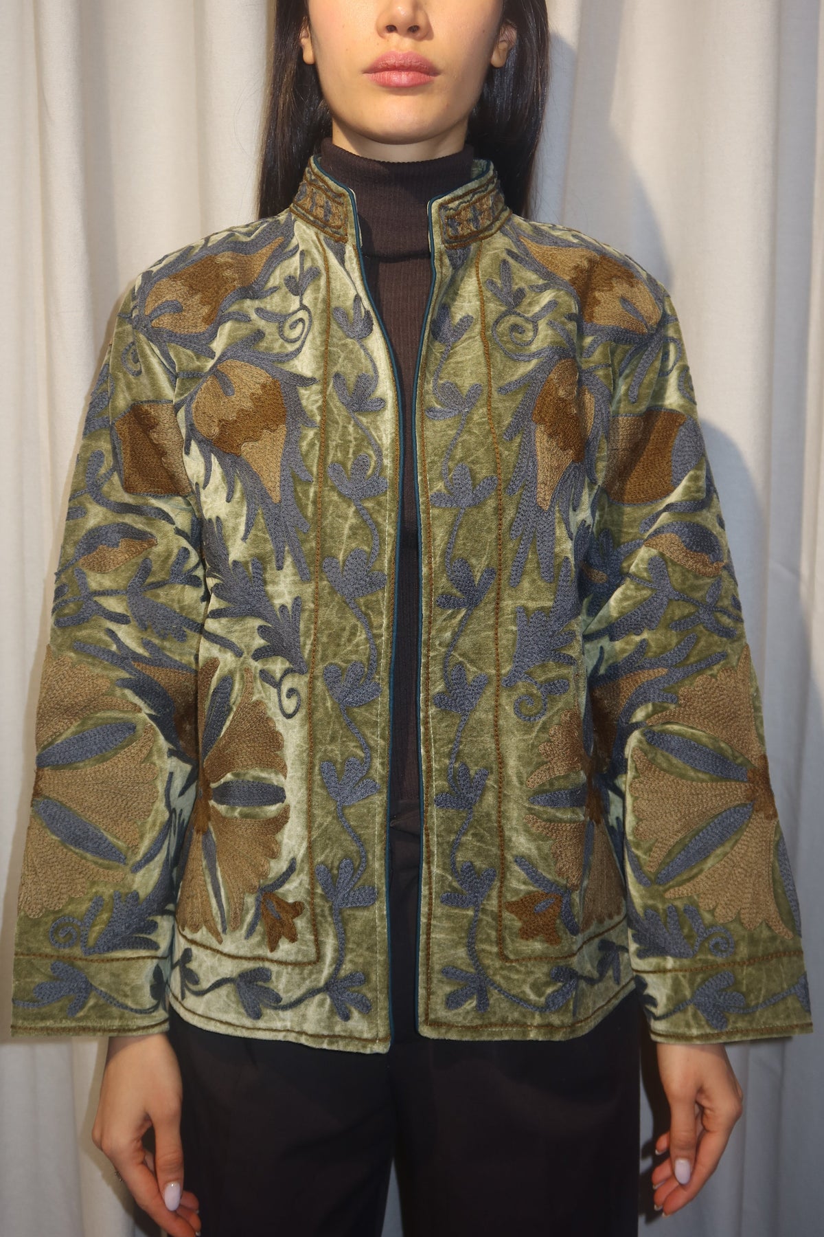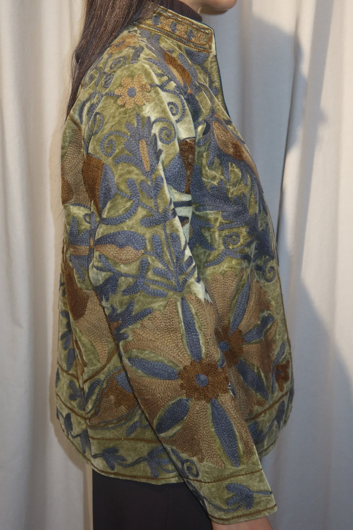 Jacket crafted from olive-green cotton velvet, embellished with floral embroidery in slate blue and golden-brown tones. Made with artisanal care, it features raised embroidery that enhances the softness and depth of the fabric, creating a refined play of light and texture. The straight cut, rounded collar, and slightly wide sleeves offer a harmonious fit, balancing comfort and structure. The interior is lined with cotton in vertical white and light-green stripes, a distinctive detail that adds freshness and character. Each seam is carefully finished to ensure durability and lasting quality. Designed to accompany the mid-season with style, it stands out for its balance between sartorial tradition and aesthetic research. A garment that embodies the union of premium materials, meticulous craftsmanship, and contemporary taste ideal for those who appreciate timeless elegance expressed with authenticity and refinement.