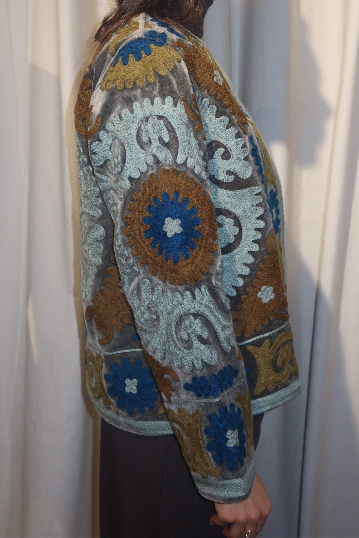 Jacket crafted from smoke-grey cotton velvet, embellished with floral embroidery in deep azure, golden ochre, and pale sage tones. Made with artisanal care, it features raised embroidery that enhances the softness and depth of the fabric, creating a refined play of light and texture. The straight cut, rounded collar, and slightly wide sleeves offer a harmonious fit, balancing comfort and structure. The interior is lined with cotton in vertical black and white stripes, a distinctive detail that adds freshness and character. Each seam is carefully finished to ensure durability and lasting quality. Designed to accompany the mid-season with style, it stands out for its balance between sartorial tradition and aesthetic research. A garment that embodies the union of premium materials, meticulous craftsmanship, and contemporary taste ideal for those who appreciate timeless elegance expressed with authenticity and refinement.