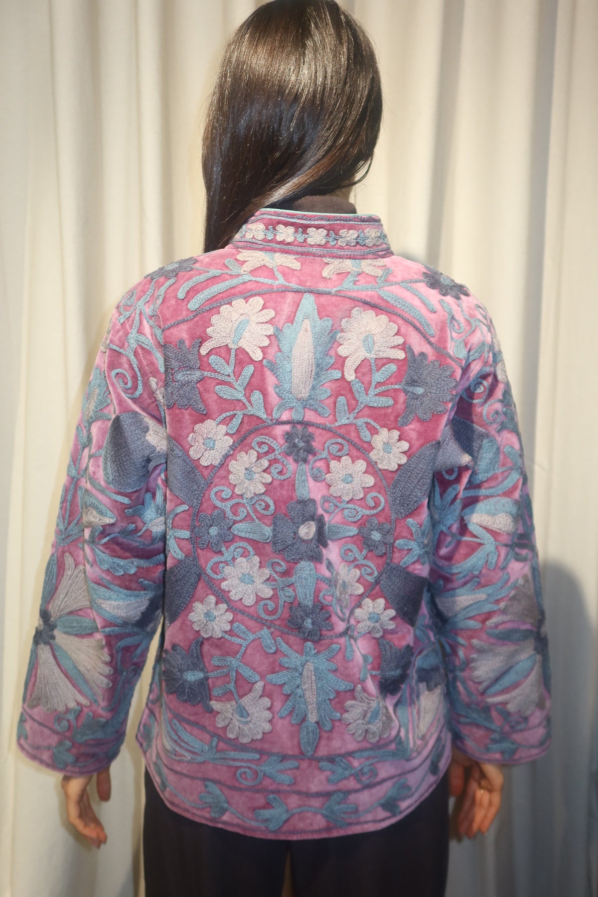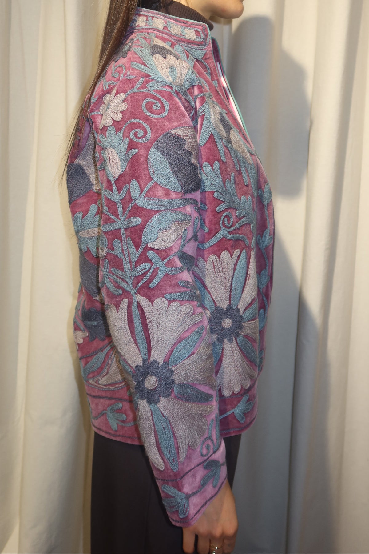 Jacket crafted from soft mauve-purple cotton velvet, embellished with floral embroidery in aqua, teal, and silver-grey tones. Made with artisanal care, it features raised embroidery that enhances the softness and depth of the fabric, creating a refined play of light and texture. The straight cut, rounded collar, and slightly wide sleeves offer a harmonious fit, balancing comfort and structure. The interior is lined with cotton in vertical stripes of fuchsia and white, a distinctive detail that adds vibrancy and character. Each seam is carefully finished to ensure durability and lasting quality. Designed to accompany the mid-season with style, it stands out for its balance between sartorial tradition and aesthetic research. A garment that embodies the union of premium materials, meticulous craftsmanship, and contemporary taste ideal for those who appreciate timeless elegance expressed with authenticity and refinement.