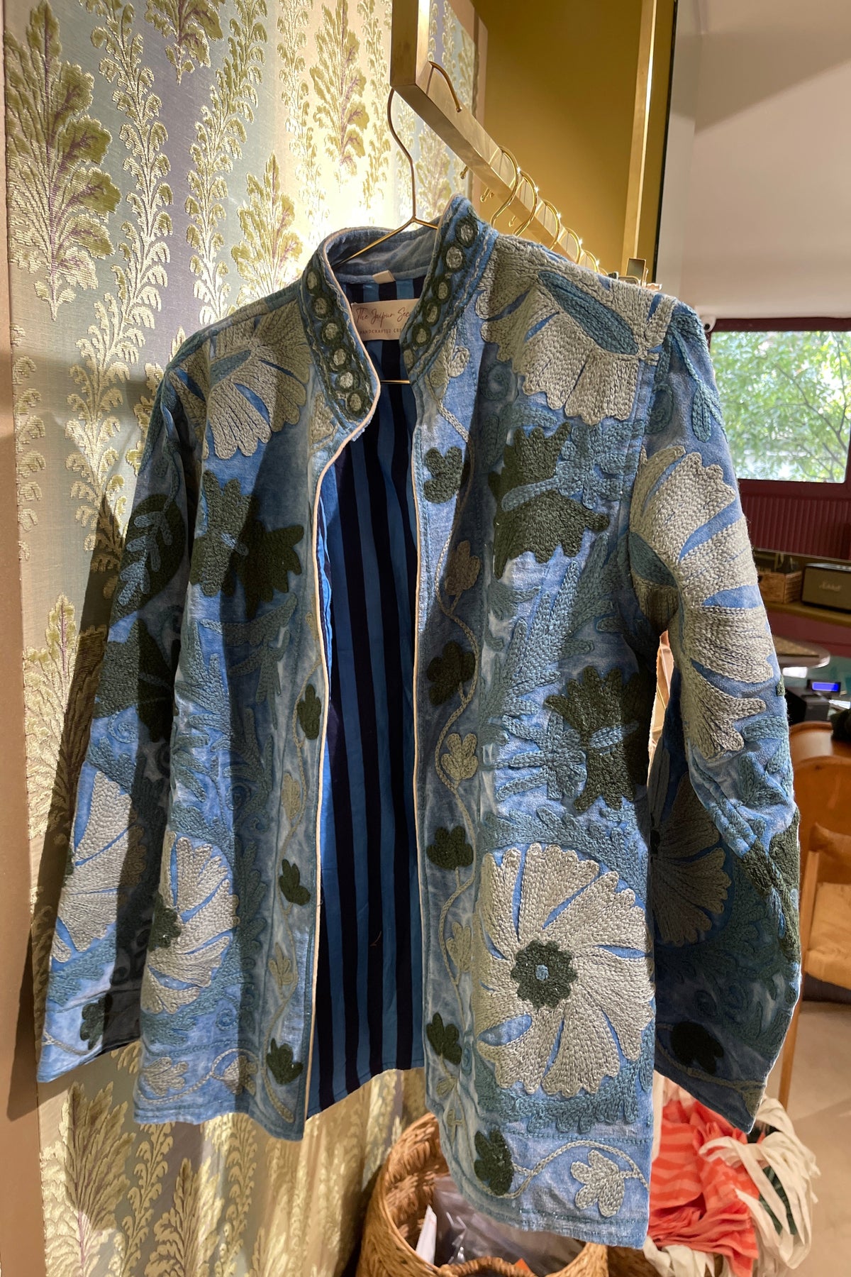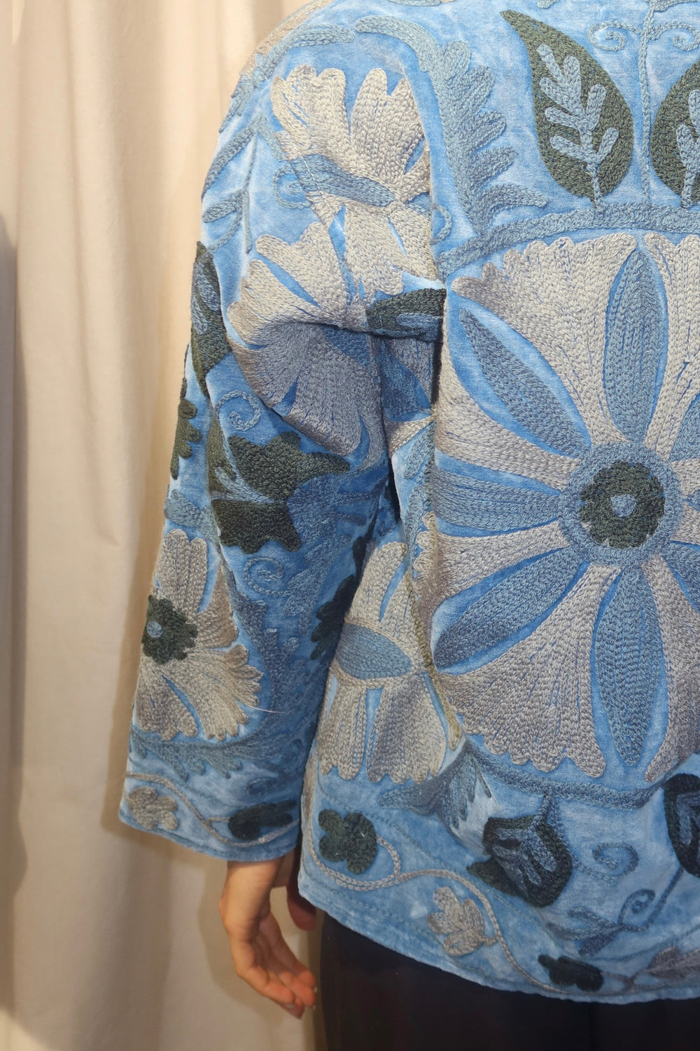 Jacket crafted from soft sky-blue cotton velvet, embellished with floral embroidery in sage, olive, and ivory tones. Made with artisanal care, it features raised embroidery that enhances the softness and depth of the fabric, creating a refined play of light and texture. The straight cut, rounded collar, and slightly wide sleeves offer a harmonious fit, balancing comfort and structure. The interior is lined with cotton in vertical stripes of navy blue and light blue, a distinctive detail that adds freshness and character. Each seam is carefully finished to ensure durability and lasting quality. Designed to accompany the mid-season with style, it stands out for its balance between sartorial tradition and aesthetic research. A garment that embodies the union of premium materials, meticulous craftsmanship, and contemporary taste ideal for those who appreciate timeless elegance expressed with authenticity and refinement.